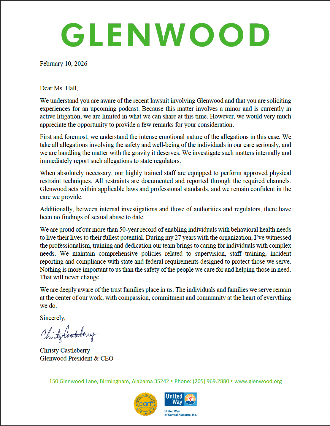 I recently received a letter from Glenwood’s CEO, Christy Castleberry, outlining the organization’s position and affirming that they take allegations seriously and that there have been no findings of sexual abuse to date. I am including that letter for transparency.